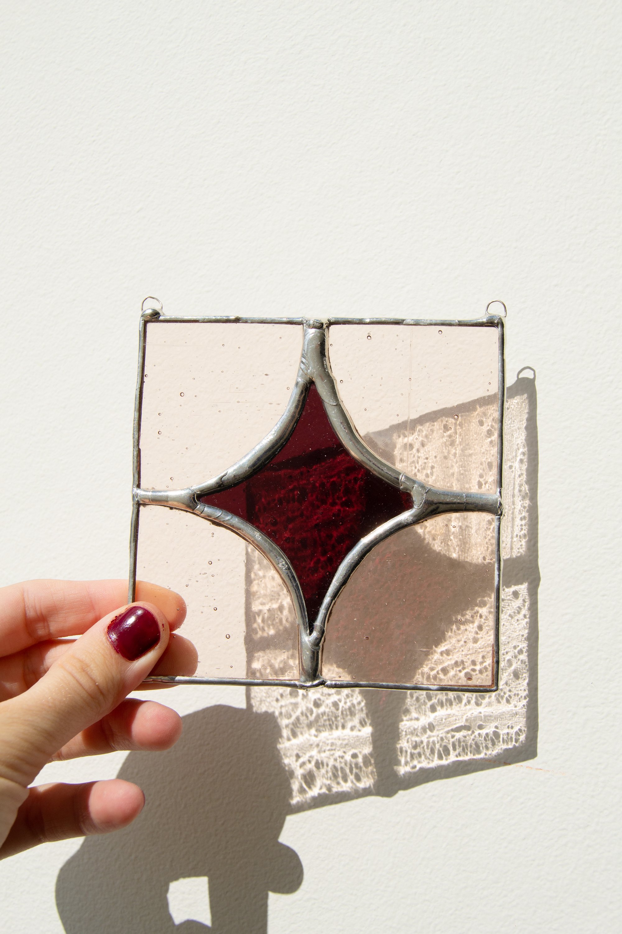 Lead-free stained glass square panel with two hooks for hanging in the window or any other place of your choice. :)