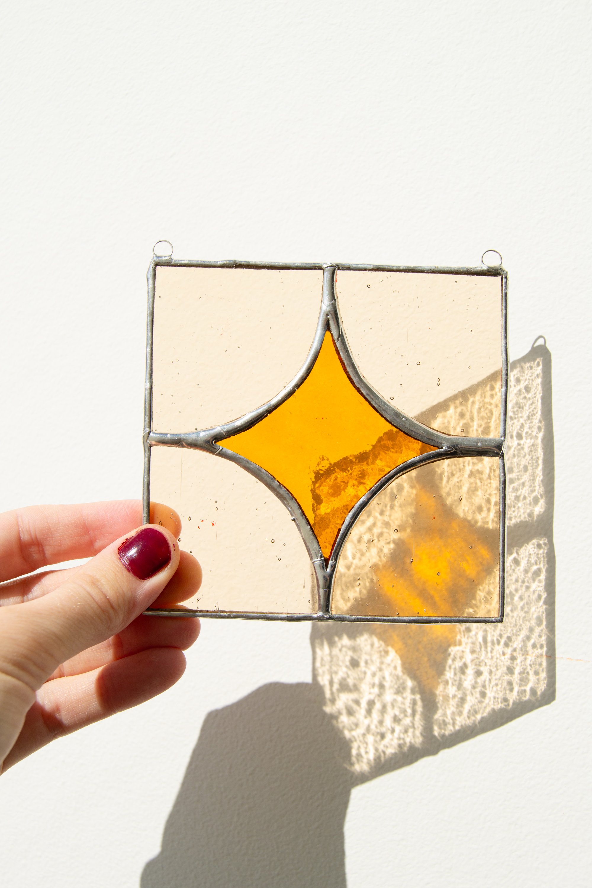 Lead-free stained glass square panel with two hooks for hanging in the window or any other place of your choice. :)